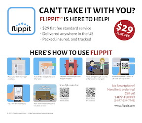 Flippit’s patented “quick-drop” system uses smartphone technology to make the process quick and easy: travelers complete the transaction at any time after security—no paper forms to fill out, no app to download, no account, username or password. Flippit charges a flat fee anywhere in the U.S., insured and tracked. Watch Flippit's 1-minute Explainer video.